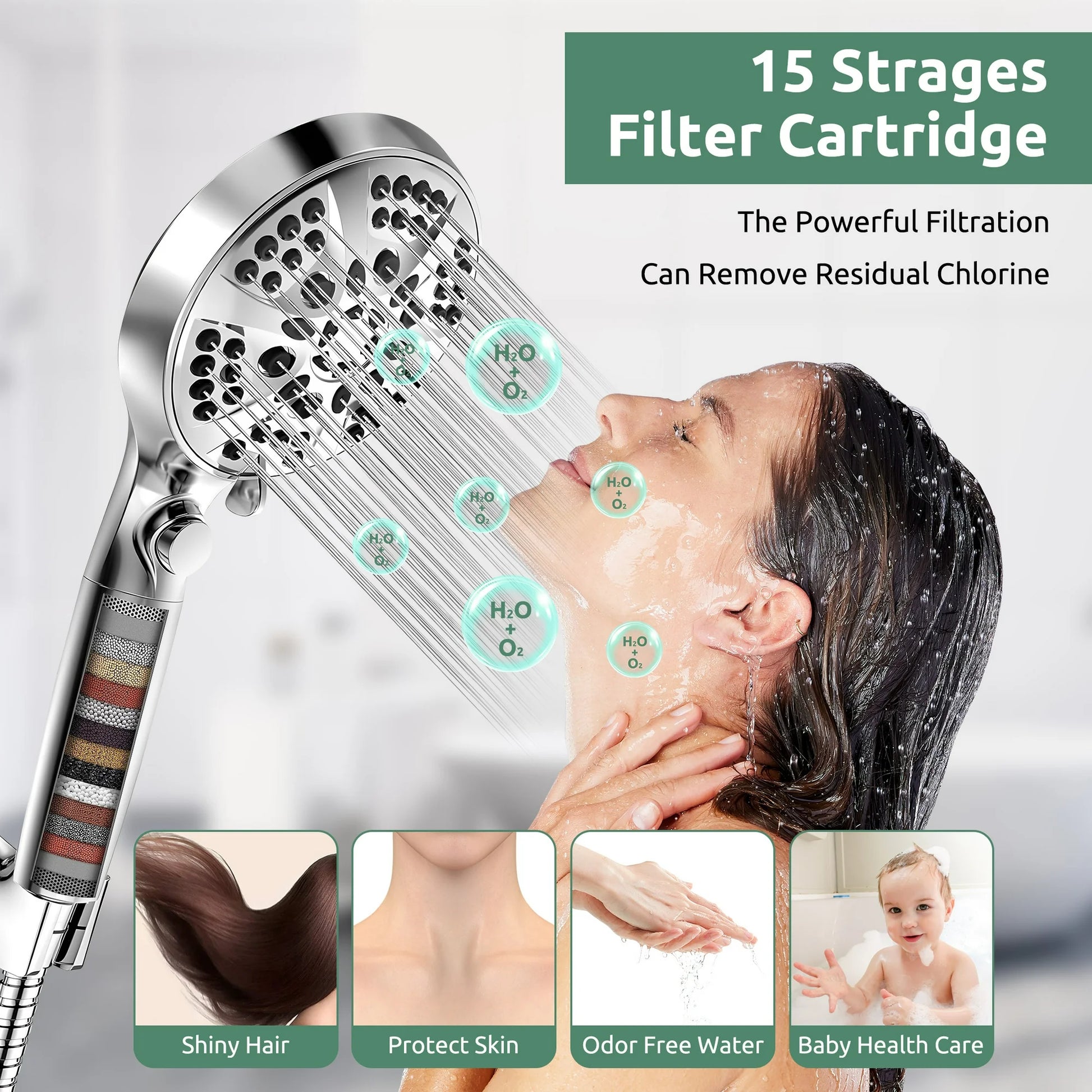 The upgraded handheld shower head comes with a built-in filter, which provides a refreshing shower experience like never before. 8 unique spray patterns to customize the perfect shower experience for you. The filtered shower head has 15 layers of filtration to remove odors and chlorine. High pressure shower heads also cleans bathtubs, tiles and pets with a stainless steel hose and dripper holder .High Pressure Handheld Shower Head with Water Stop Button,enjoy bathing and save water.