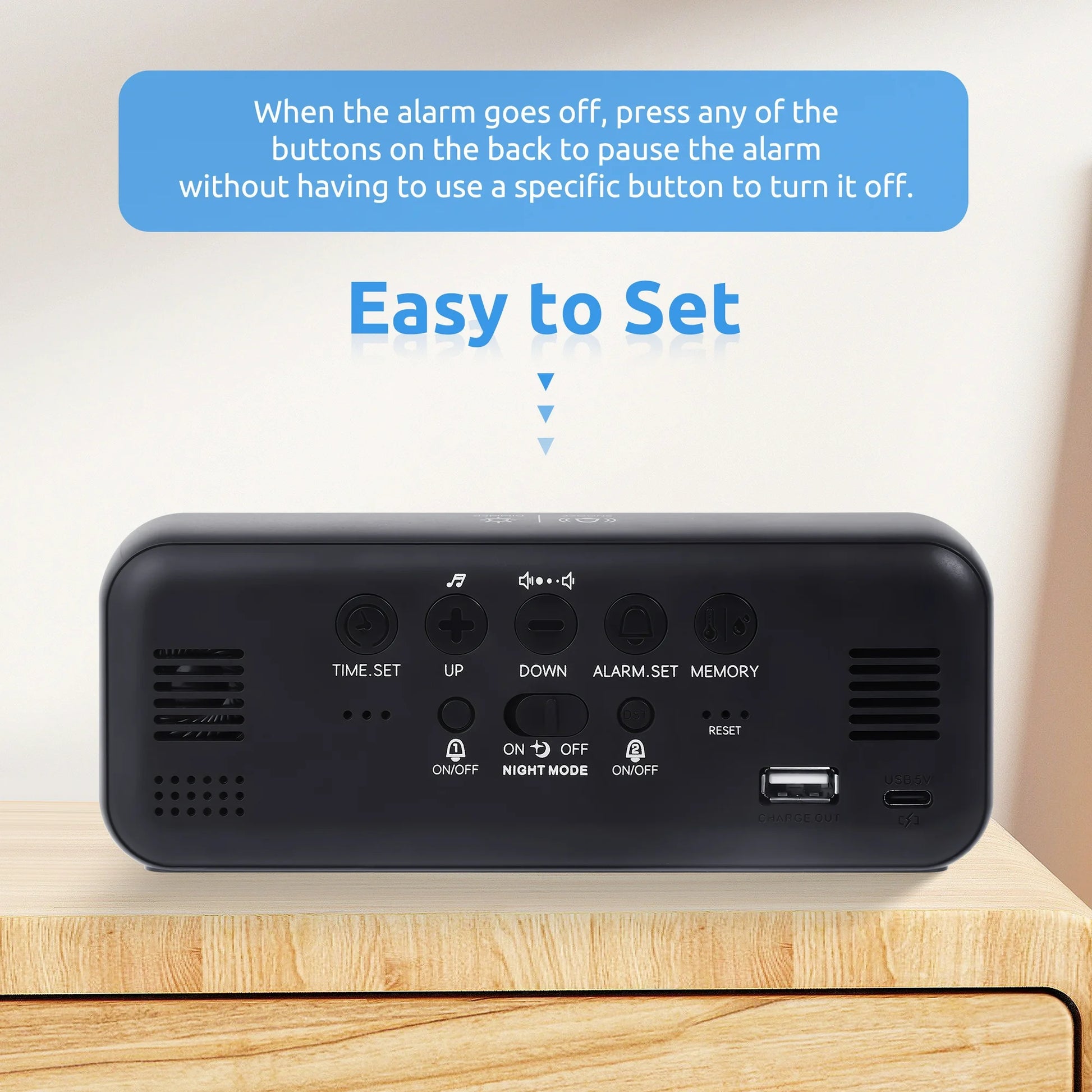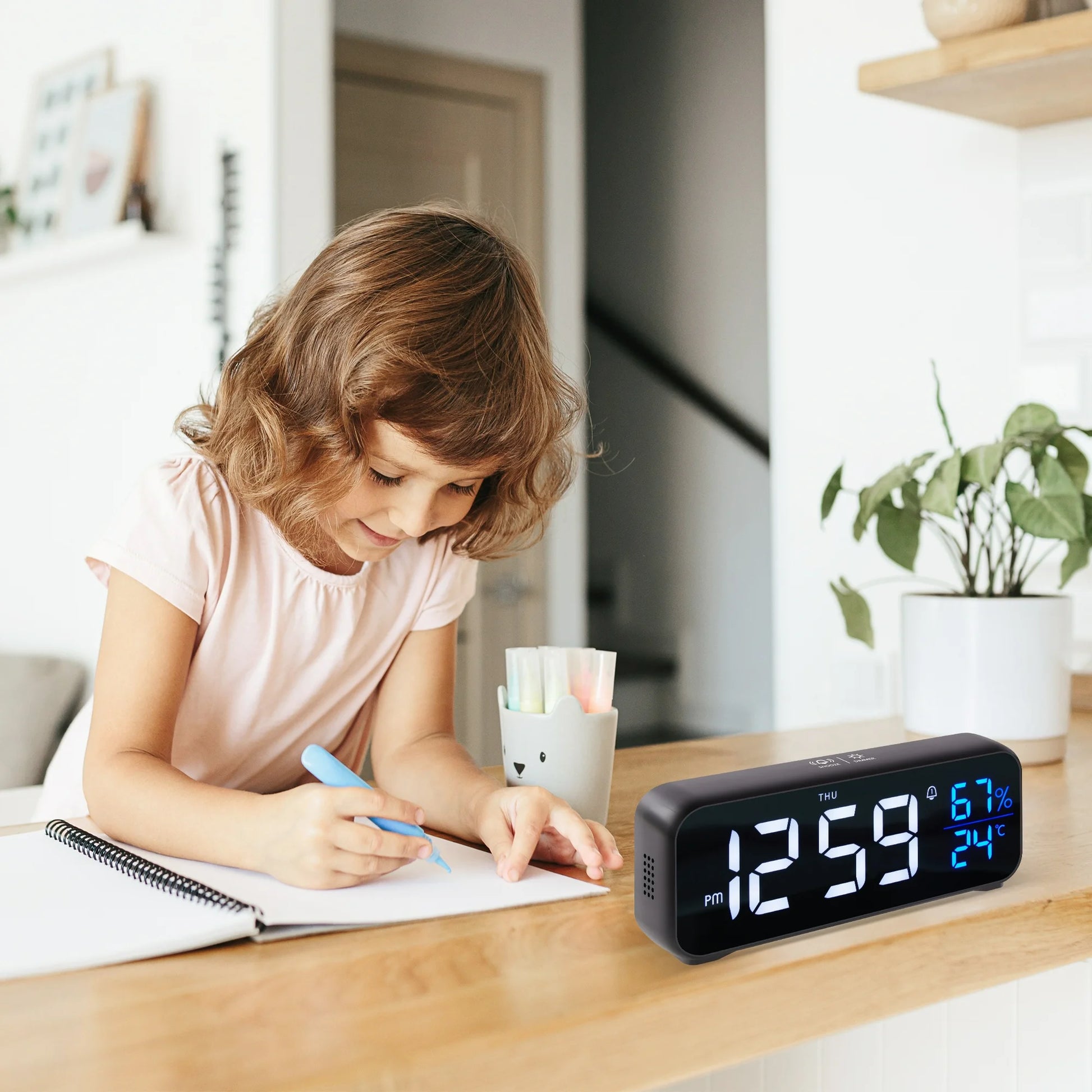 Designed with functionality in mind, this electronic bedside clock includes dual alarms, allowing you to set two different wake-up times for you and your partner. It also displays both temperature and humidity, helping you maintain a comfortable environment in your living space. Choose between a convenient 12 or 24-hour format to match your time preference. Plus, the snooze function lets you catch a few extra minutes of sleep when you need it most.